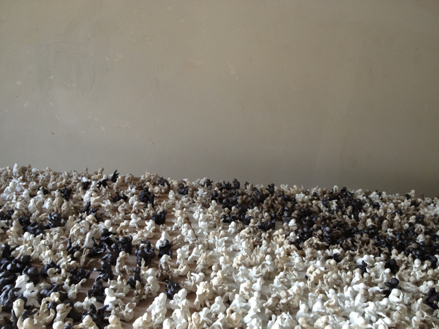 D:… Yes, possibly. Or, rather than competition, it was contraposition. The fact that I created small things certainly made me think a lot, and the great number compensated for the dimensions. But I also saw that only in great quantity the babies took on a real form, like small fish which defend themselves from larger ones through strength of numbers. Moreover, I’m fascinated by the change in perspective, from afar the mass of babies looks like a heap of stones, while close up they become recognizable in their individuality and monstrosity. And creating the babies also had a therapeutic effect, because the women demanded an enormous mental effort from me. To make a woman I had to prepare all day; to create her I had to do other things, embroider fabrics, draw. Or make babies.