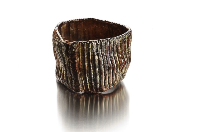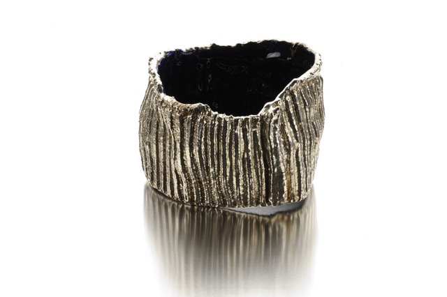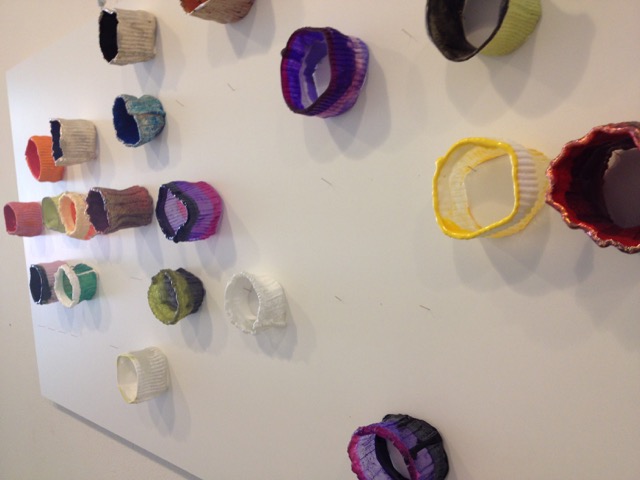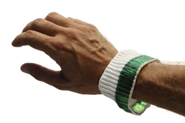 My bracelets, called Identity Crises are textile turned to metal or plastic. Textile my preferred material, soft and accommodating becomes hard and stiff, everlasting (maybe) colourful and lots of fun.