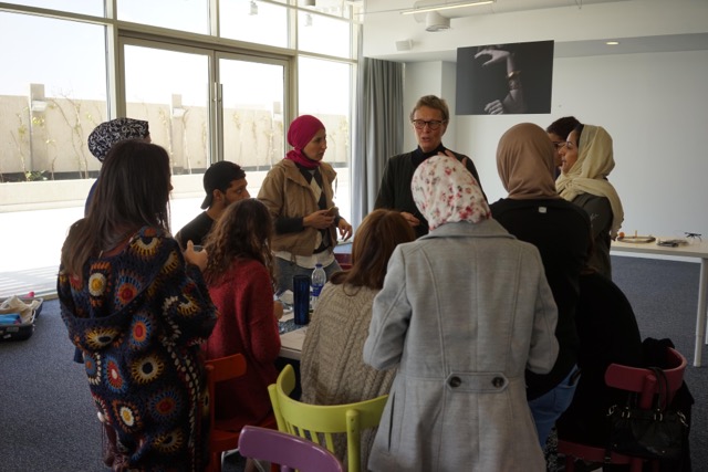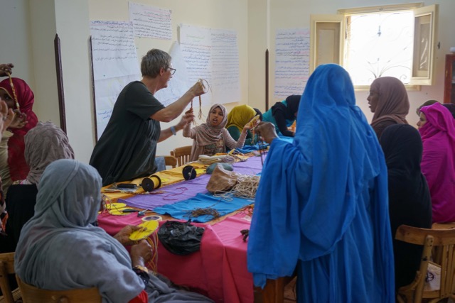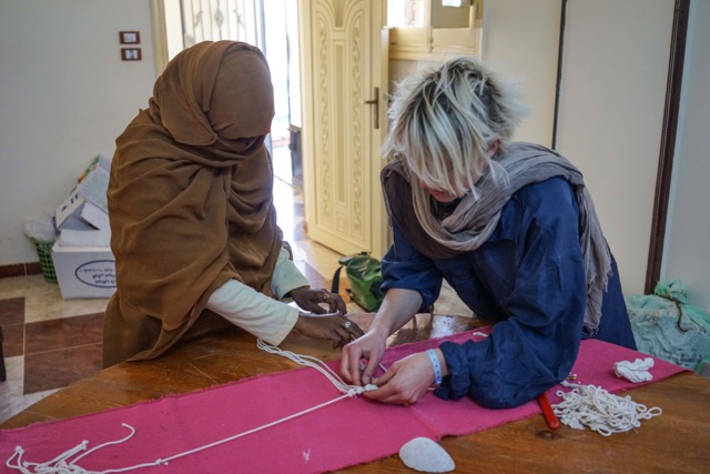 a little Beduin village, maybe not that little at the end there is a quite big camel market and a bank and a little handcraft shop, lots of children, beautiful people, lots of goats and the 4 of us Lili, Piero, Dina, me plus Ibrahim giving a workshop on Makrame techniques in leather to the ladies of the village.